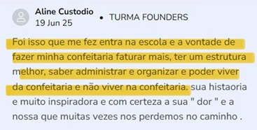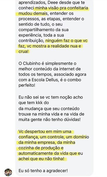 Um espaço real e sem filtro onde você terá acesso aos bastidores das estratégias que deram certo (ou errado), tendências da confeitaria, conteúdos exclusivos e uma verdadeira troca com outras confeiteiras e confeiteiros, que vão fazer você evoluir como pessoa e empresária.